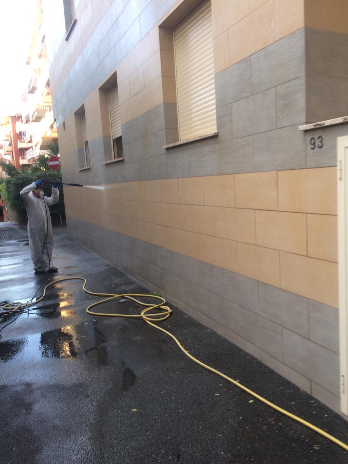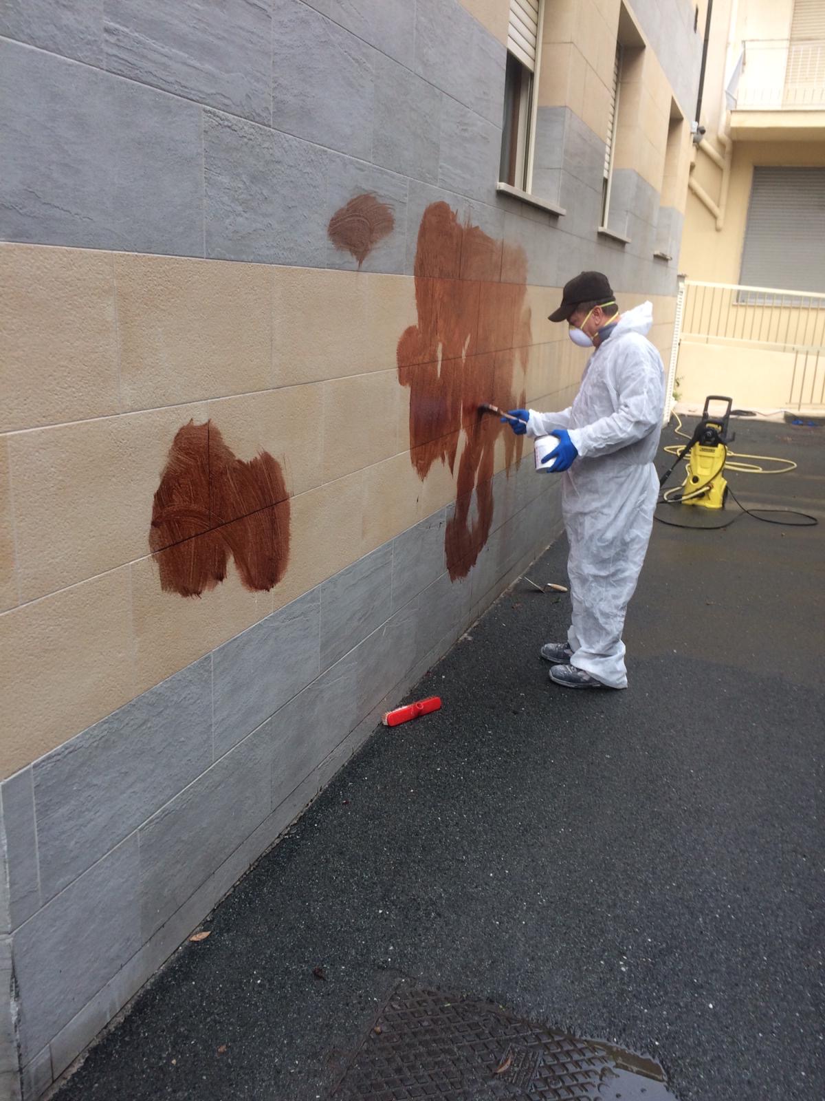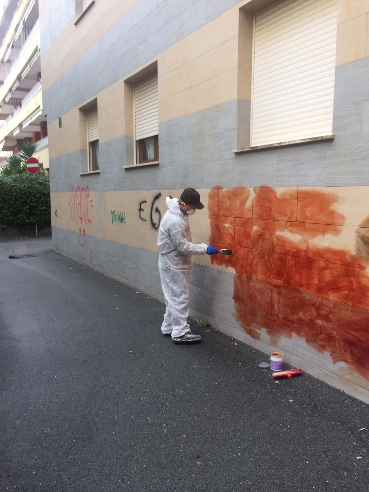 Eseguita pulizia di una facciata condominiale in via Asse a Ventimiglia per la rimozione di graffiti attraverso l’utilizzo di speciali solventi e idropulitrici.